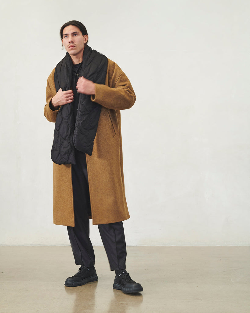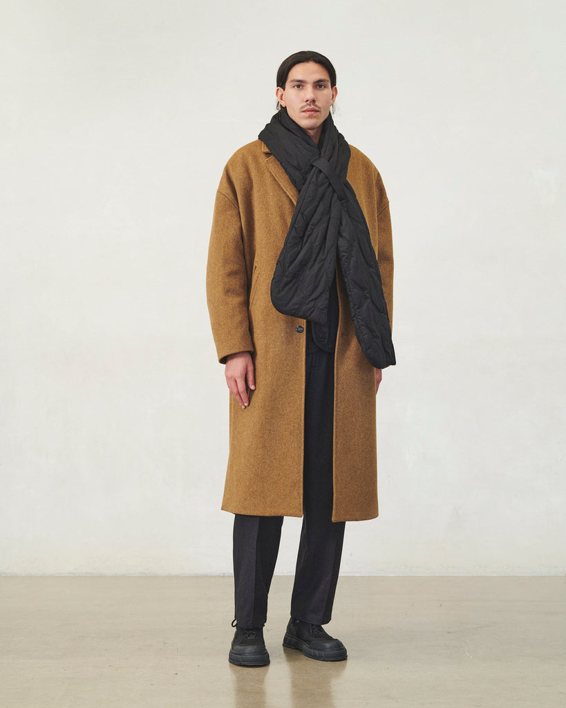 Développée et fabriquée à Paris, l'écharpe matelassée est une pièce en coton popeline noir.