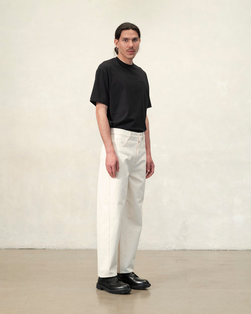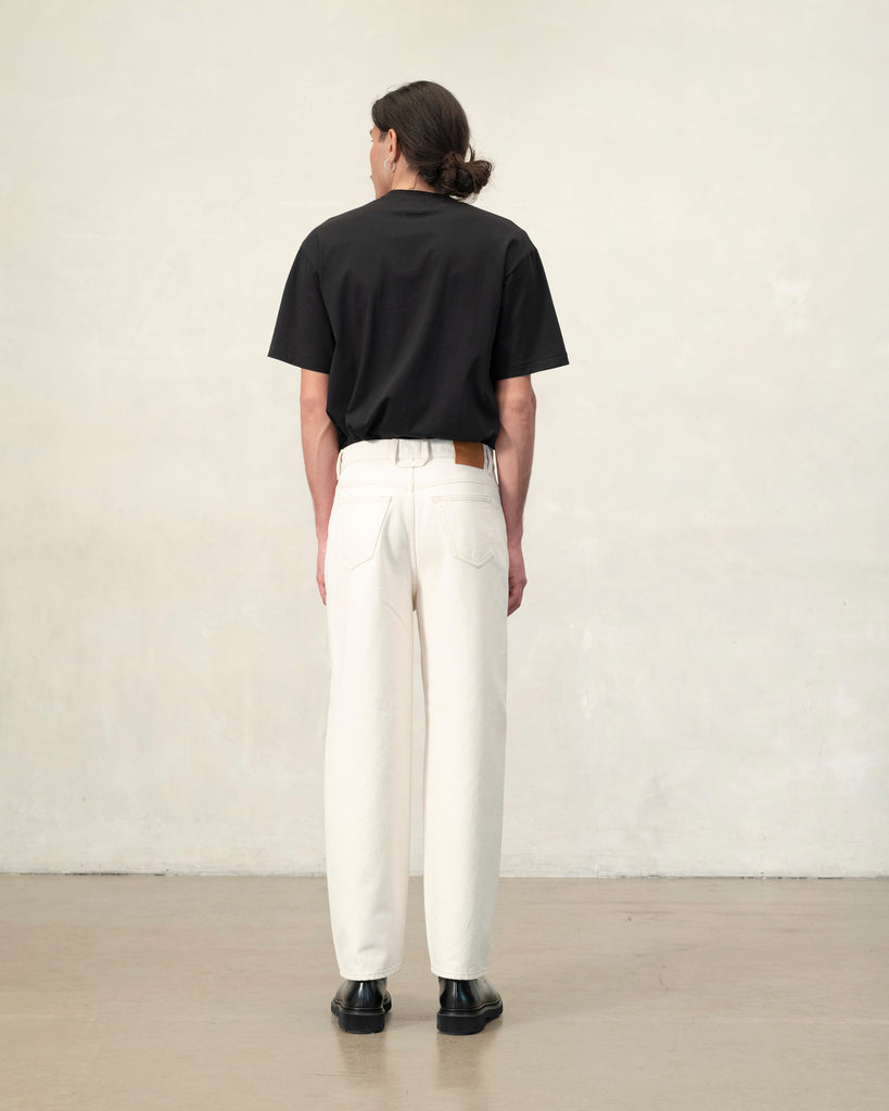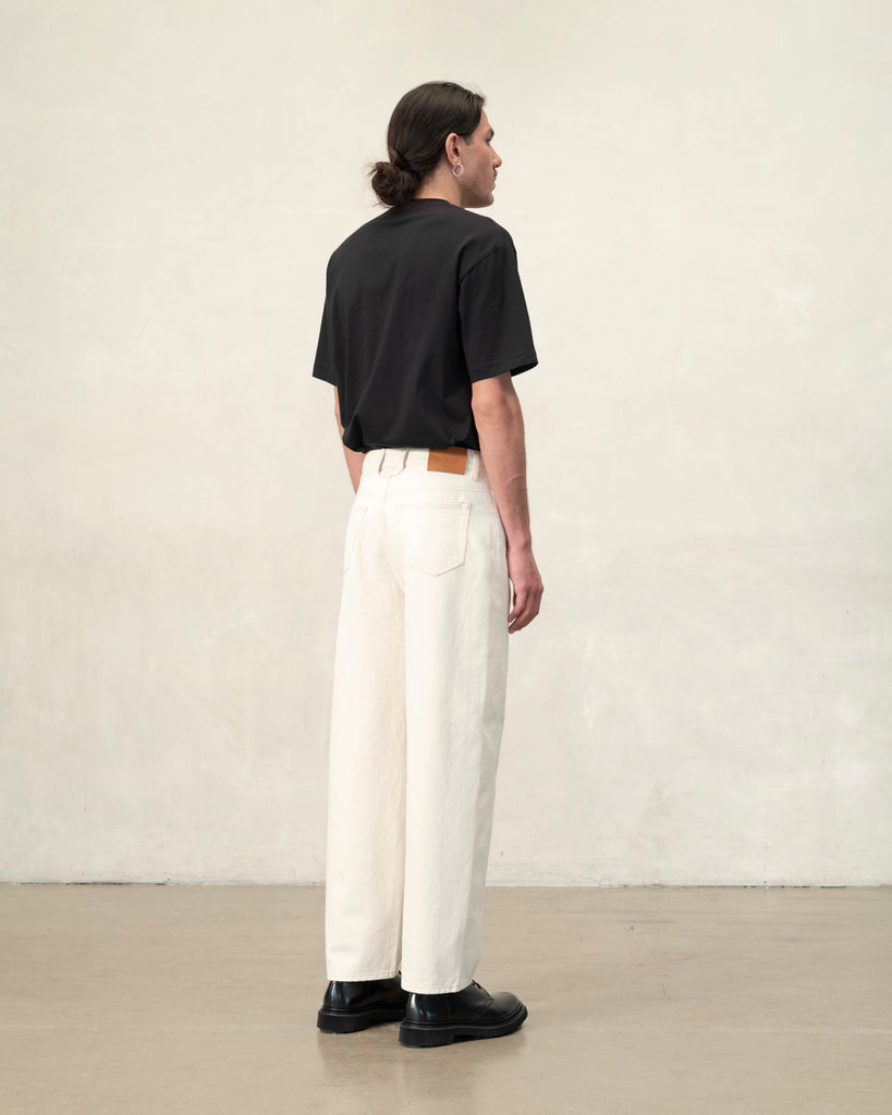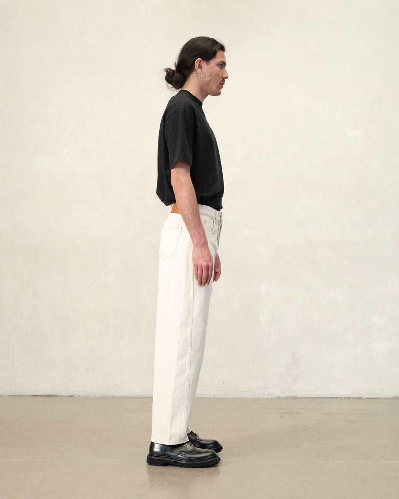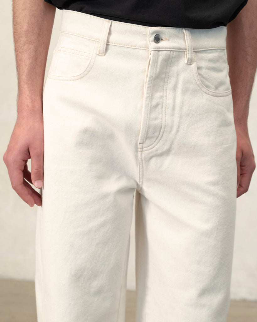 Pantalon en coton denim espagnol, avec une coupe large et une couture latérale tournante pour suivre la forme naturelle du corps.
