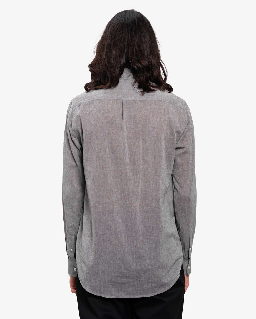 Alpher est une chemise de coupe classique, fabriquée à partir d'un tissu japonais gris texturé et de boutons en nacre.