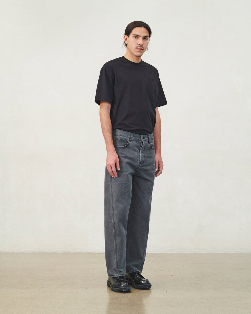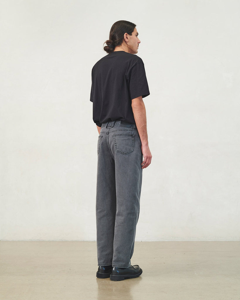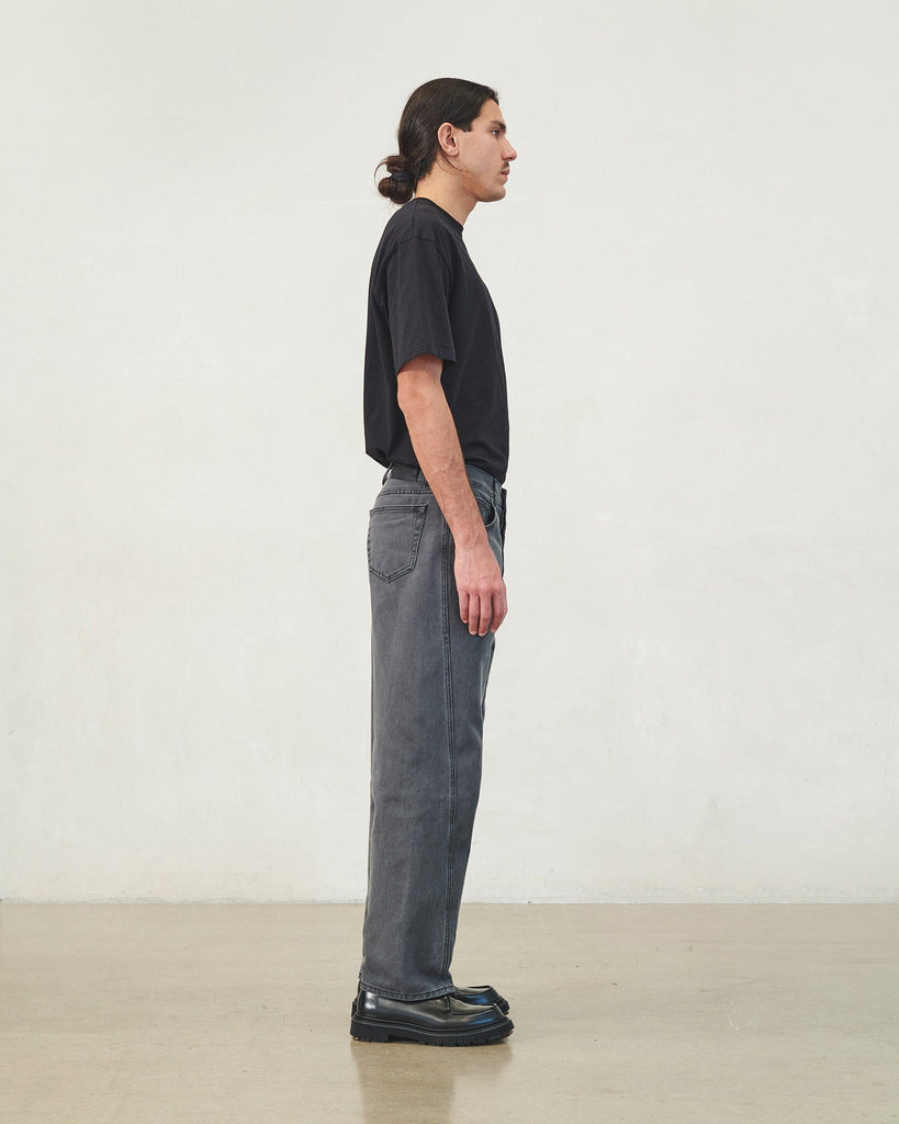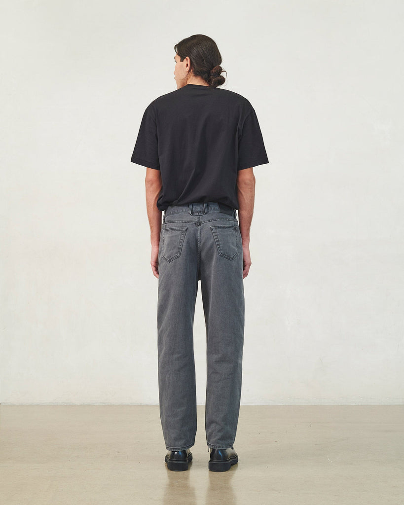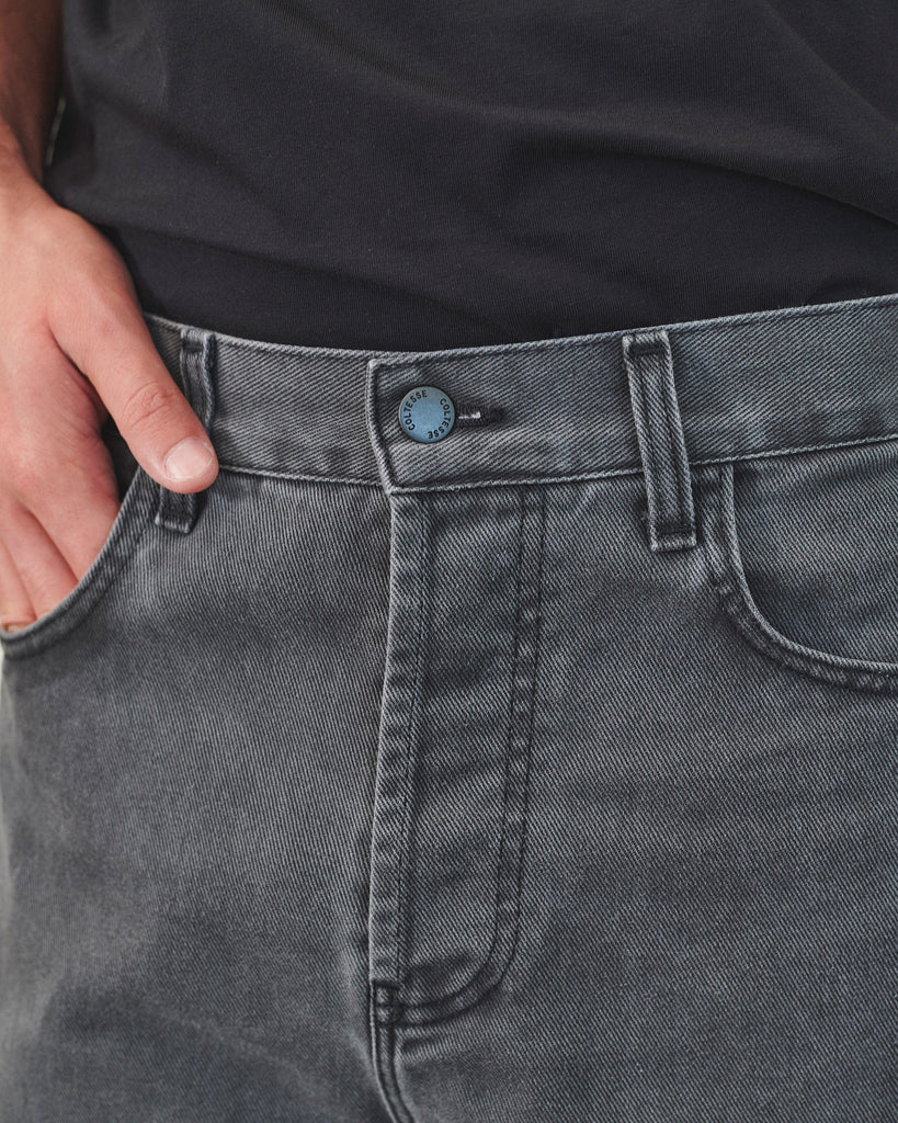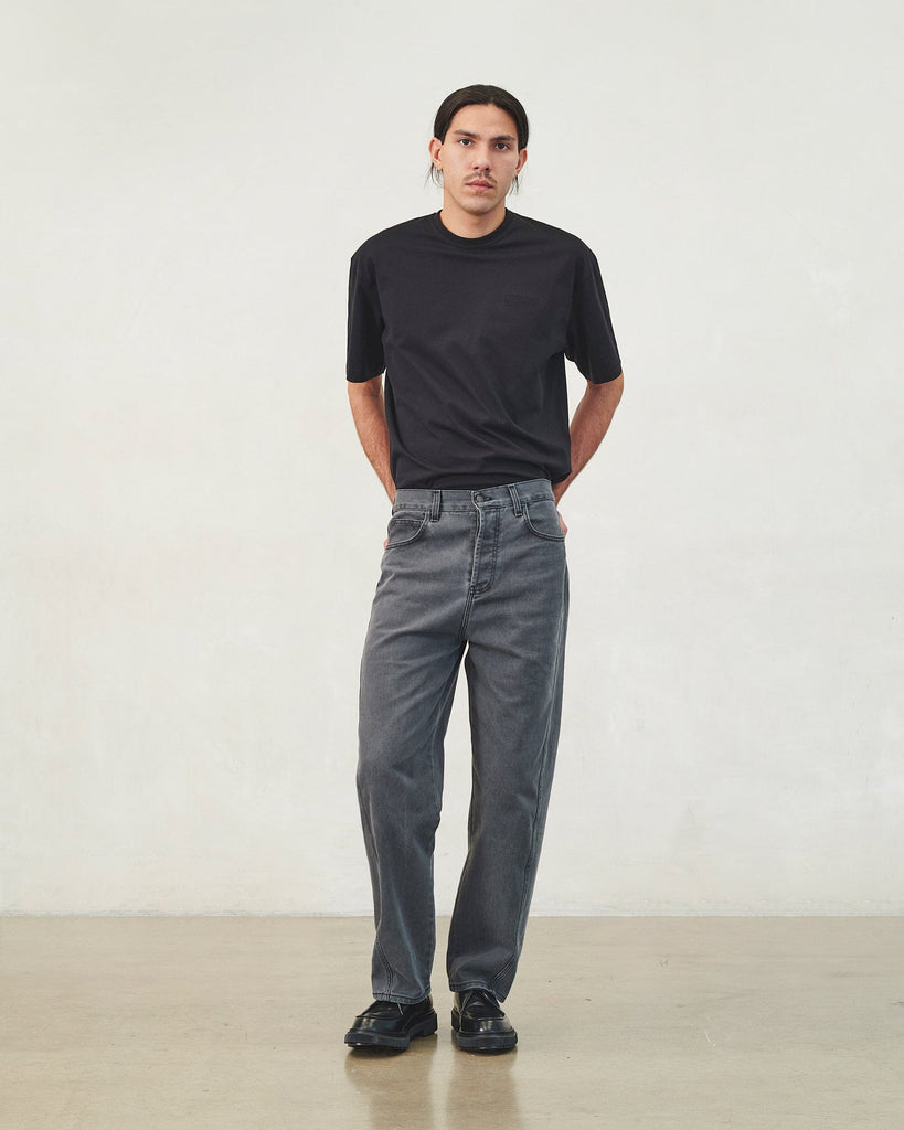 Pantalon en coton denim espagnol, avec une coupe large et une couture latérale tournante pour suivre la forme naturelle du corps.