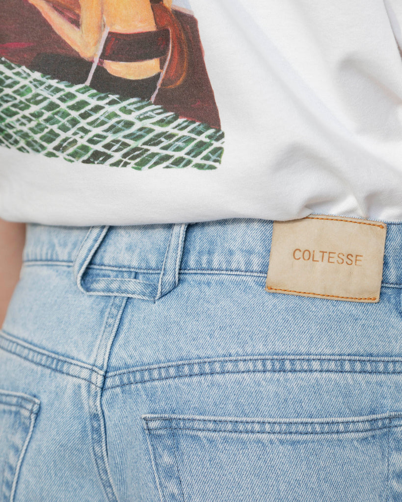Autres détails : ceinture plate à passants, braguette à boutons, étiquette Coltesse en cuir.