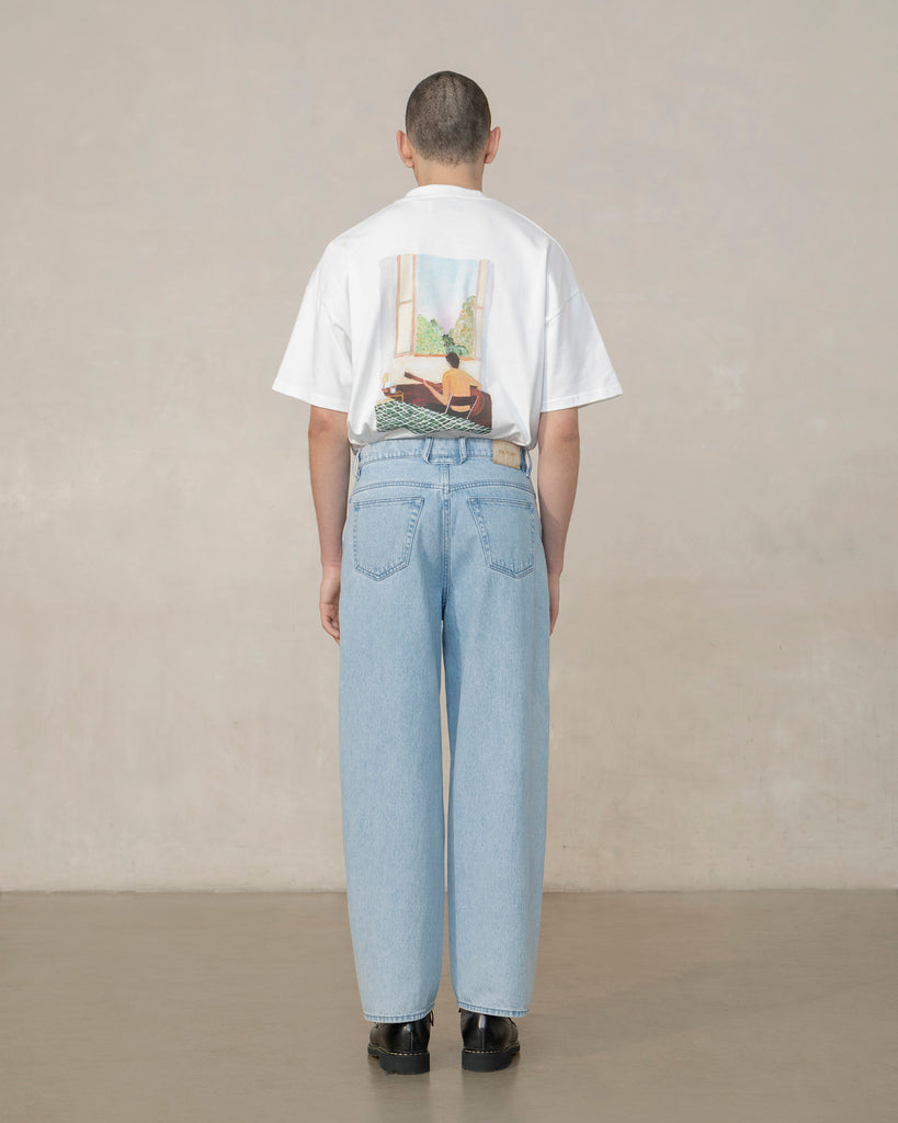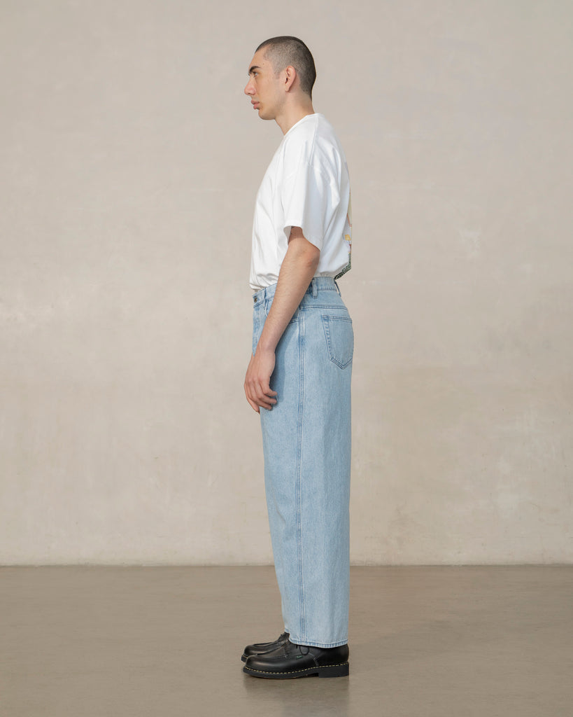 Pantalon en denim de coton espagnol, avec une coupe large et une couture latérale tournante pour suivre la forme naturelle du corps. Son aspect délavé est obtenu grâce à un traitement à l'ozone, qui réduit la consommation d'eau.