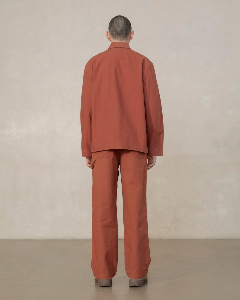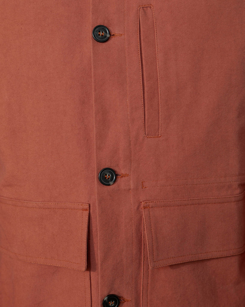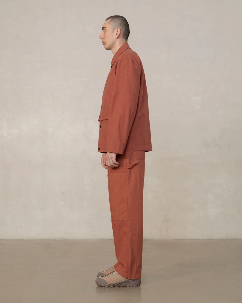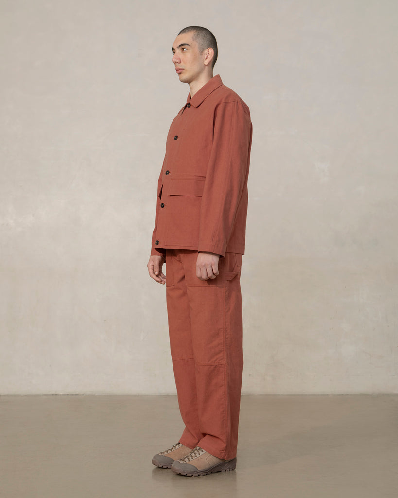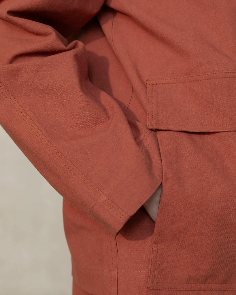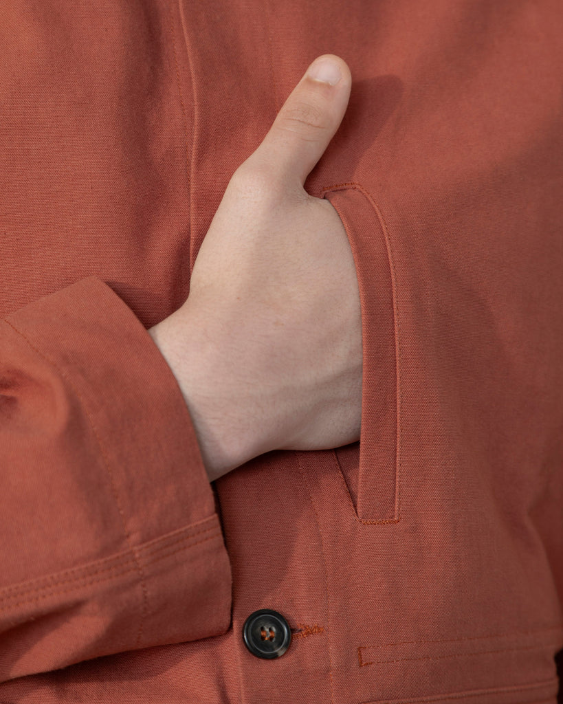 Fabriquée en canevas coton biologique provenant de la région des Vosges, cette veste de workwear toutes saisons est à la fois durable et élégante. Elle comprend six poches pratiques - deux frontales, deux latérales plaquées et deux intérieures - pour un maximum de praticité. Elle est également dotée d'une boucle de suspension au niveau du col et d'empiècements au niveau des coudes.
